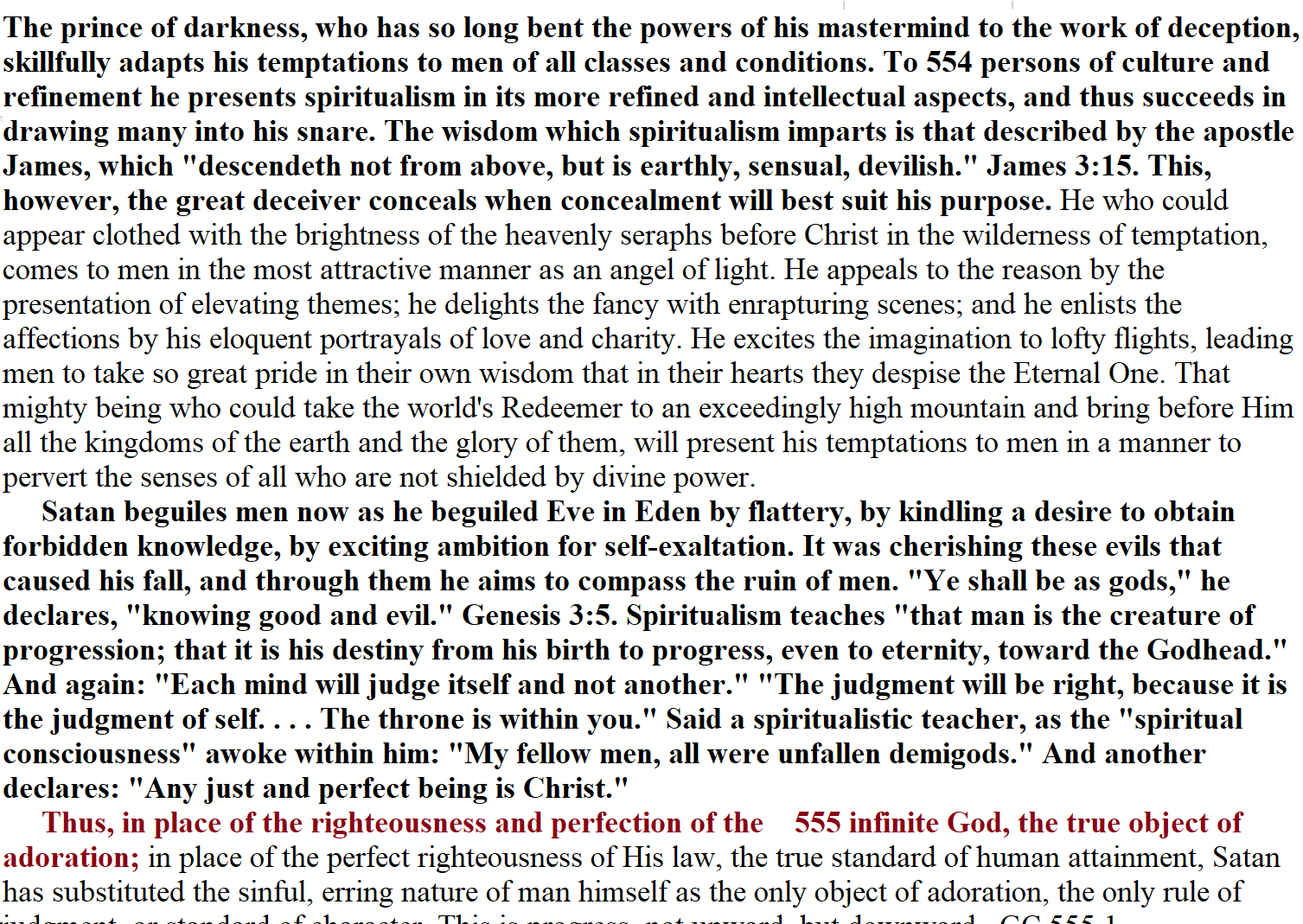 Spiritualism declares that there is no death, no sin, no judgment, no retribution; that “men are unfallen demigods”; that desire is the highest law; and that man is accountable only to himself. The barriers that God has erected to guard truth, purity, and reverence, are broken down, and many are thus emboldened in sin. Does not such teaching suggest an origin similar to that of demon worship?—The Signs of the Times, June 30, 1890.