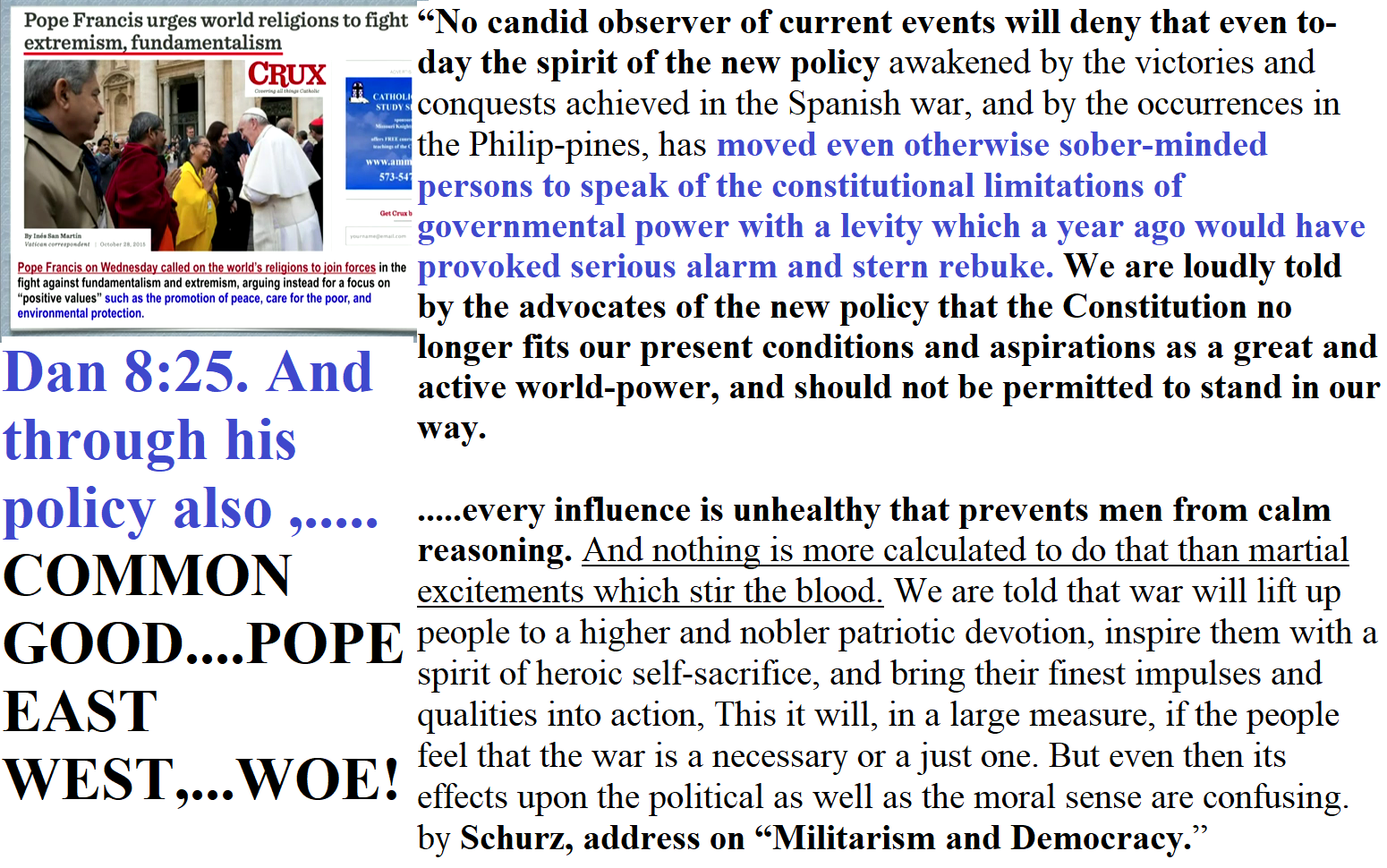 There are many who believe that the churches and churchmen should have nothing to do with politics. None hold this view more stanchly than I do. Nevertheless, it is as true to-day as it was in centuries past and gone that prophets and priests are sent by the Lord to warn kings and nations concerning the retribution which will be visited upon them by the King of kings and Lord of lords, if they depart from the path which a divine hand has mapped out for their feet. In this sense, and in this sense only, do I believe that the voice of the ambassadors of Jesus Christ should be heard in the courts and congresses of human powers, of earthly governments. And it is because I firmly believe that if the United States persists in the course she has entered upon, her ruin and the ruin of the world can be the only result, that I have penned these lines. Prophets were sent to heathen kings, as well as to the monarchs who sat on Israel’s throne. They were sent because God loved the people, and did all that infinite love and mercy could do to save them from a general doom. If the nation as a whole heeded not, as was often the case, there were individuals who listened to the voice of the ambassadors of the Lord, and were kept from the dire troubles which God sent upon the rebellious state. My life has been devoted to the affairs of religion and spirituality. I have never been a member in any sense of any political party, and have never in my life cast a vote in city, State, or national elections. In saying this I would in no sense judge my brethren who have considered it their duty to do this; suffice it to say that it has been my conviction that as a citizen of the kingdom of heaven, and as an ambassador of Jesus Christ, I would serve humanity the best by holding entirely aloof from the political strifes which divide men into factions and parties, and devoting my strength to the sweetest of all ministries, that of reconciliation between Christ and sinners. It is only in instances like the present, when the things which are done are the things which are warned against in the Word of God, that I feel free to lift my voice and pen, trusting and praying that the spirit in which I write may rest upon and enter into those who read. With me the events which are now transpiring are not the working out of mere political theories, but of great prophetical principles. It is for this reason that I write. It is because I wish my position upon this matter of Christians in politics to be clearly understood that I have taken time and space for this digression. PRUS 158.3