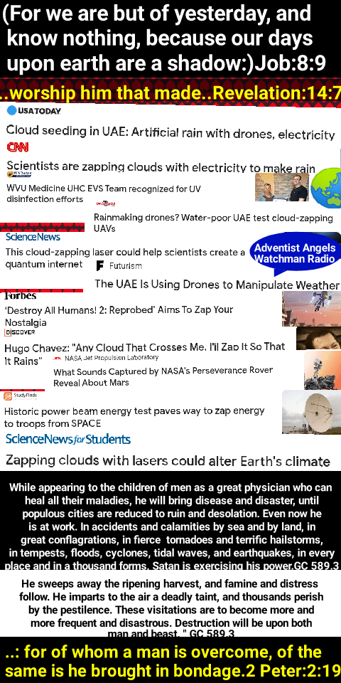 While appearing to the children of men as a great physician who can heal all their maladies, he will bring disease and disaster, until populous cities are reduced to ruin and desolation. Even now he is at work. In accidents and calamities by sea and by land, in great conflagrations, in fierce tornadoes and terrific hailstorms, in tempests, floods, cyclones, tidal waves, and earthquakes, in every place and in a thousand forms, Satan is exercising his power. He sweeps away the ripening harvest, and famine and distress follow. He imparts to the air a deadly taint, and thousands perish by the pestilence. These visitations are to become more and more frequent and disastrous. Destruction will be upon both man and beast. “The earth mourneth and fadeth away,” “the haughty people … do languish. The earth also is defiled under the inhabitants thereof; because they have transgressed the laws, changed the ordinance, broken the everlasting covenant.” Isaiah 24:4, 5.
