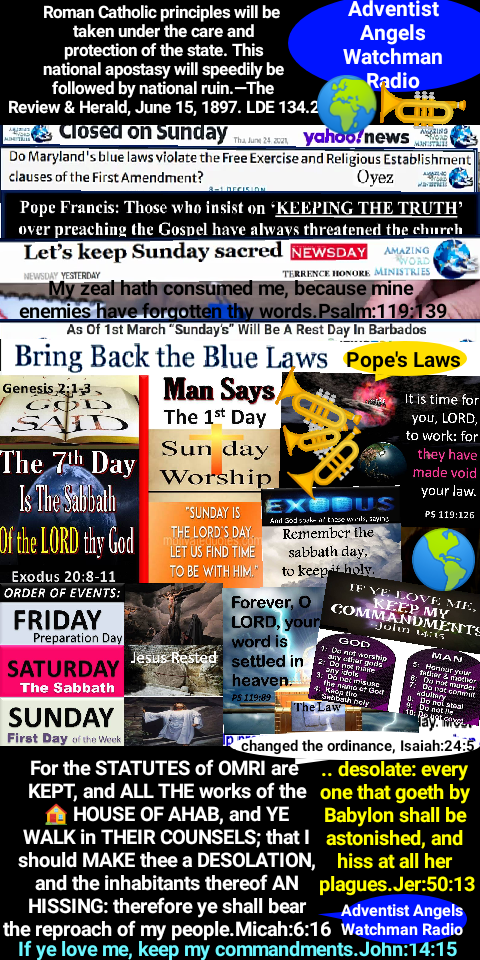 But notwithstanding all the efforts to establish Sunday sacredness, papists themselves publicly confessed the divine authority of the Sabbath and the human origin of the institution by which it had been supplanted. In the sixteenth century a papal council plainly declared: “Let all Christians remember that the seventh day was consecrated by God, and hath been received and observed, not only by the Jews, but by all others who pretend to worship God; though we Christians have changed their Sabbath into the Lord’s Day.”— Ibid., pages 281, 282. Those who were tampering with the divine law were not ignorant of the character of their work. They were deliberately setting themselves above God GC 575.2 – GC 577.2h and say their prayers, lest they bring some great calamity on themselves and neighbors. An ecclesiastical council brought forward the argument, since so widely employed, even by Protestants, that because persons had been struck by lightning while laboring on Sunday, it must be the Sabbath. “It is apparent,” said the prelates, “how high the displeasure of God was upon their neglect of this day.” An appeal was then made that priests and ministers, kings and princes, and all faithful people “use their utmost endeavors and care that the day be restored to its honor, and, for the credit of Christianity, more devoutly observed for the time to come.”—Thomas Morer, Discourse in Six Dialogues on the Name, Notion, and Observation of the Lord’s Day, page 271.