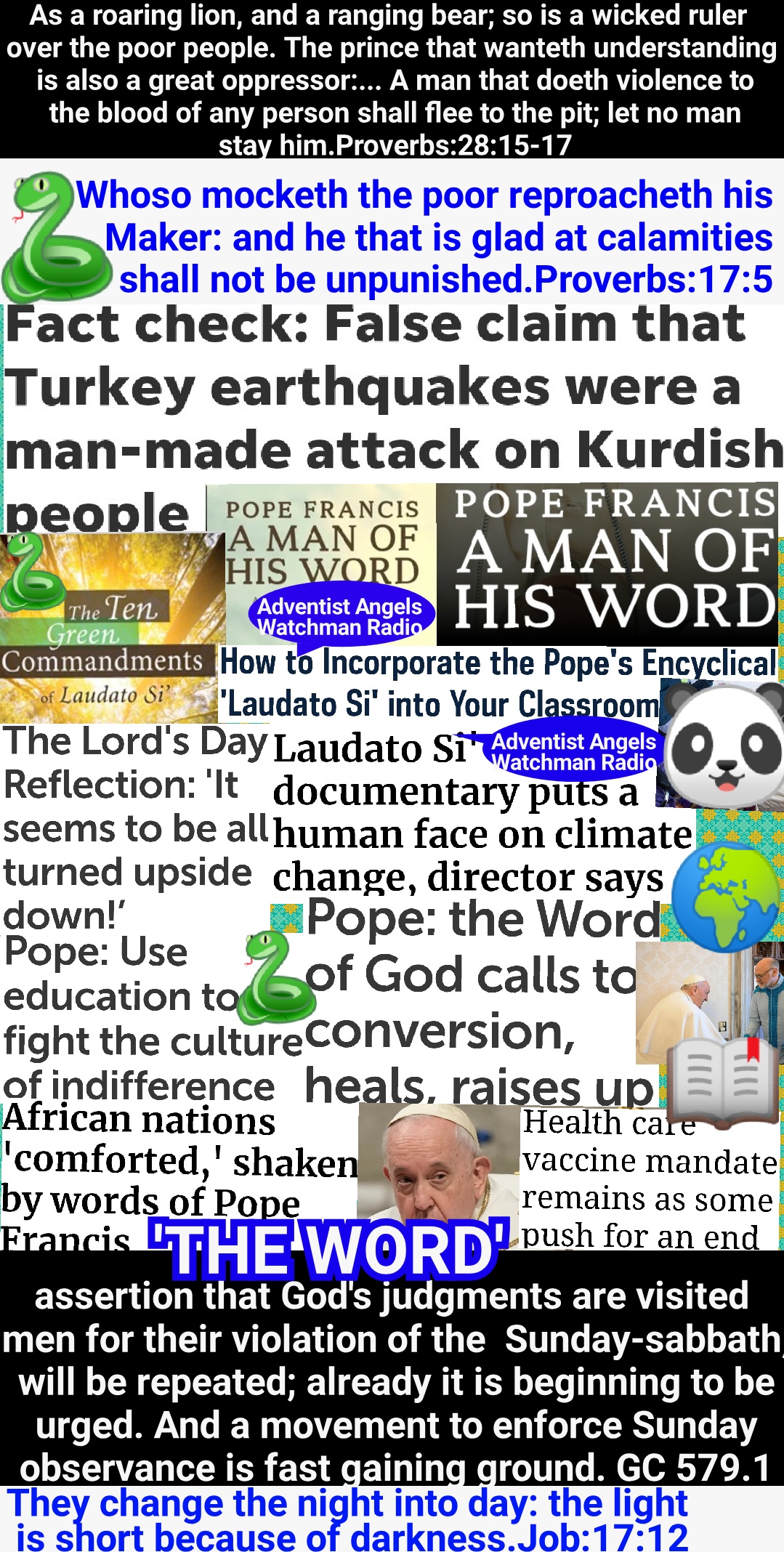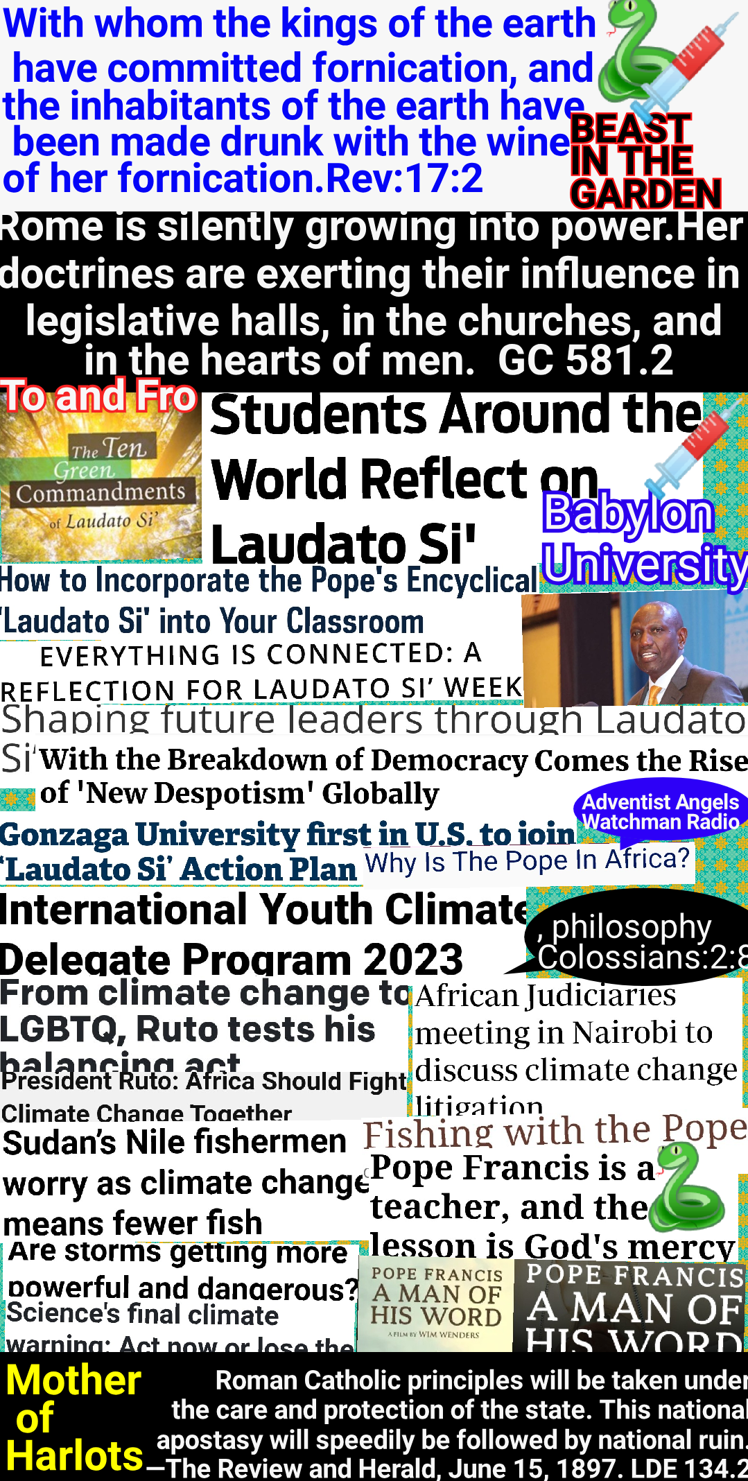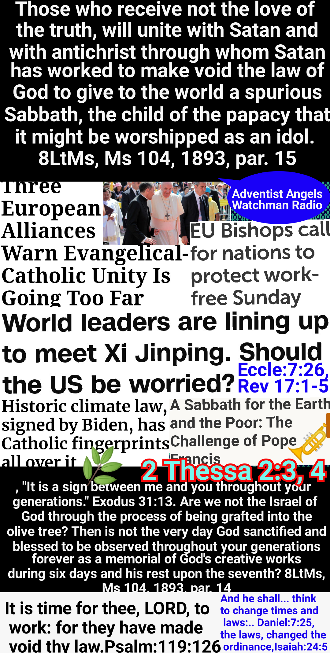 Satan’s policy in this final conflict with God’s people is the same that he employed in the opening of the great controversy in heaven. He professed to be seeking to promote the stability of the divine government, while secretly bending every effort to secure its overthrow. And the very work which he was thus endeavoring to accomplish he charged upon the loyal angels. The same policy of deception has marked the history of the Roman Church. It has professed to act as the vicegerent of Heaven, while seeking to exalt itself above God and to change His law. Under the rule of Rome, those who suffered death for their fidelity to the gospel were denounced as evildoers; they were declared to be in league with Satan; and every possible means was employed to cover them with reproach, to cause them to appear in the eyes of the people and even to themselves as the vilest of criminals. So it will be now. While Satan seeks to destroy those who honor God’s law, he will cause them to be accused as lawbreakers, as men who are dishonoring God and bringing judgments upon the world GC 591.1