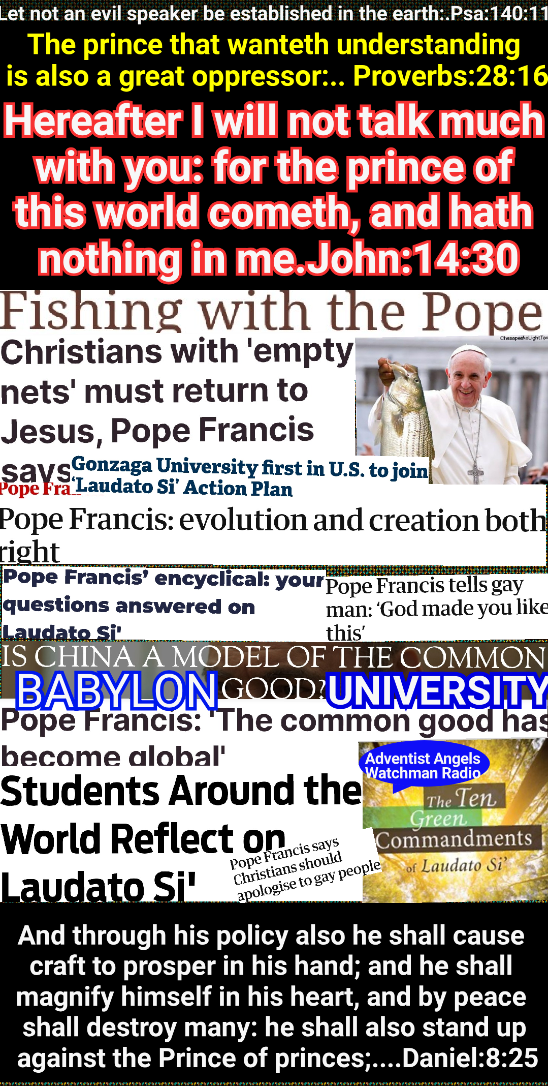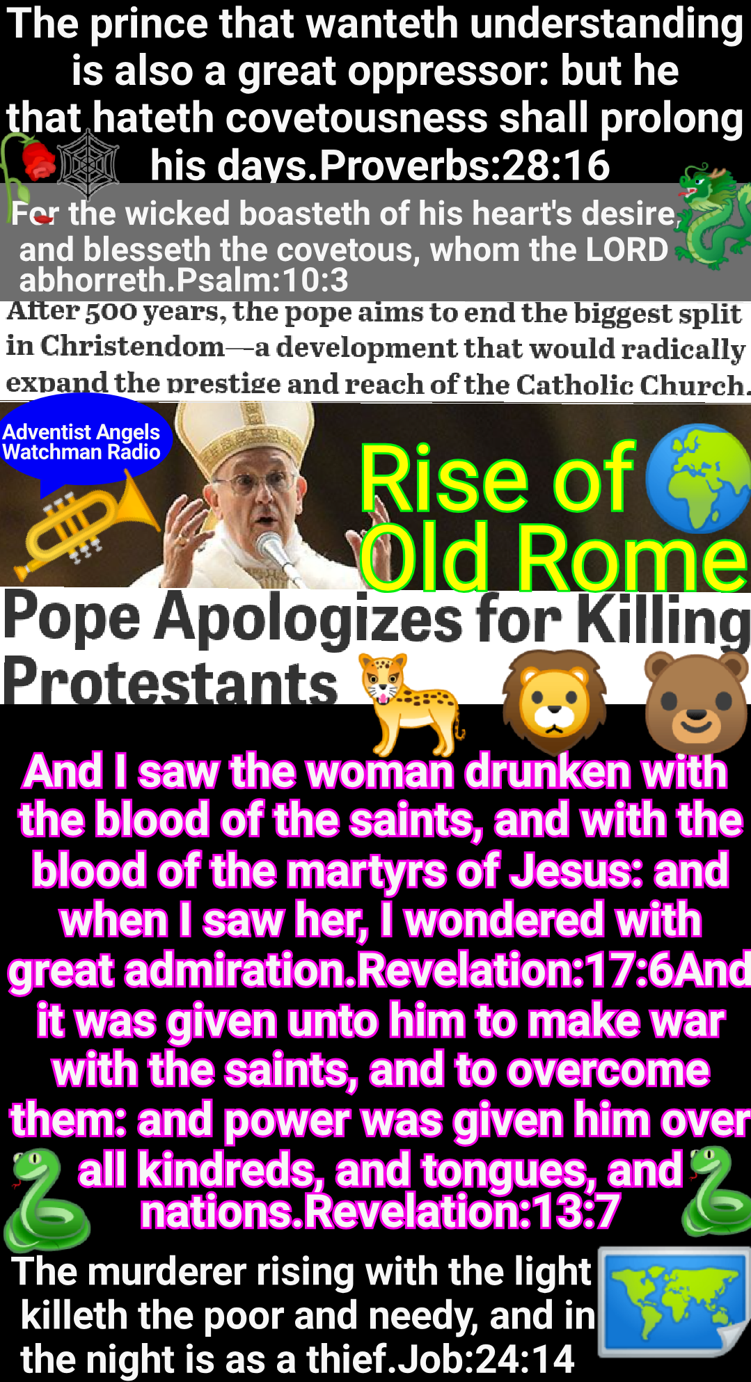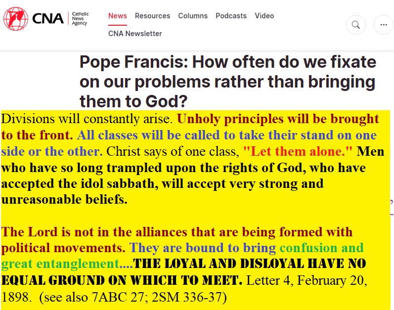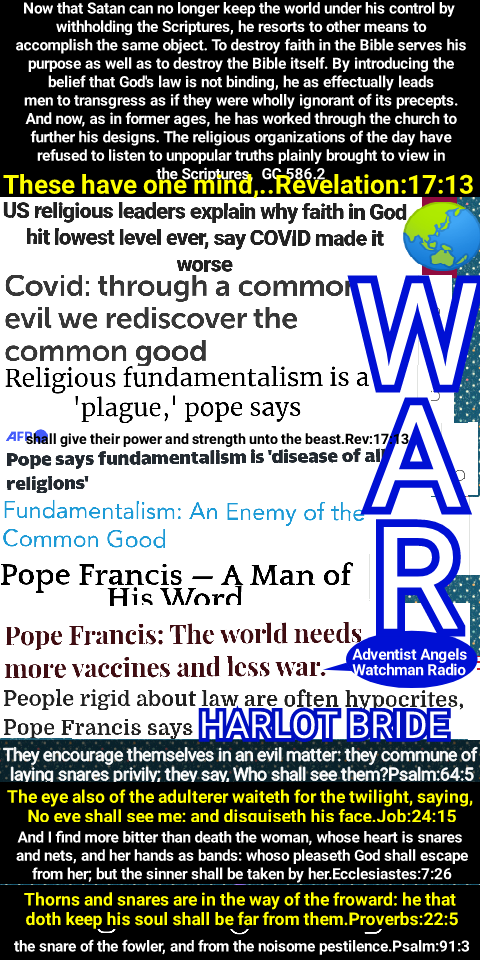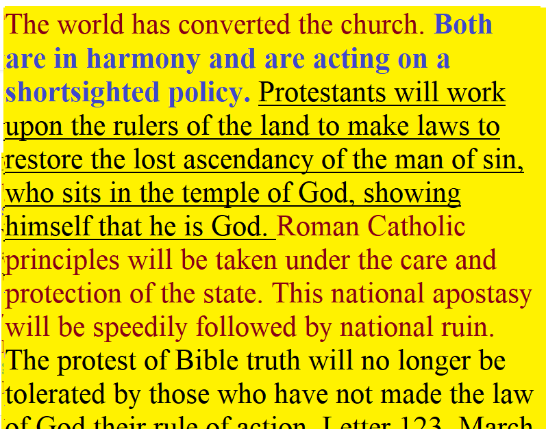 Through the two great errors, the immortality of the soul and Sunday sacredness, Satan will bring the people under his deceptions. While the former lays the foundation of spiritualism, the latter creates a bond of sympathy with Rome. The Protestants of the United States will be foremost in stretching their hands across the gulf to grasp the hand of spiritualism; they will reach over the abyss to clasp hands with the Roman power; and under the influence of this threefold union, this country will follow in the steps of Rome in trampling on the rights of conscience. GC 586.2 – GC 588.1 #adventistangelswatchmanradio