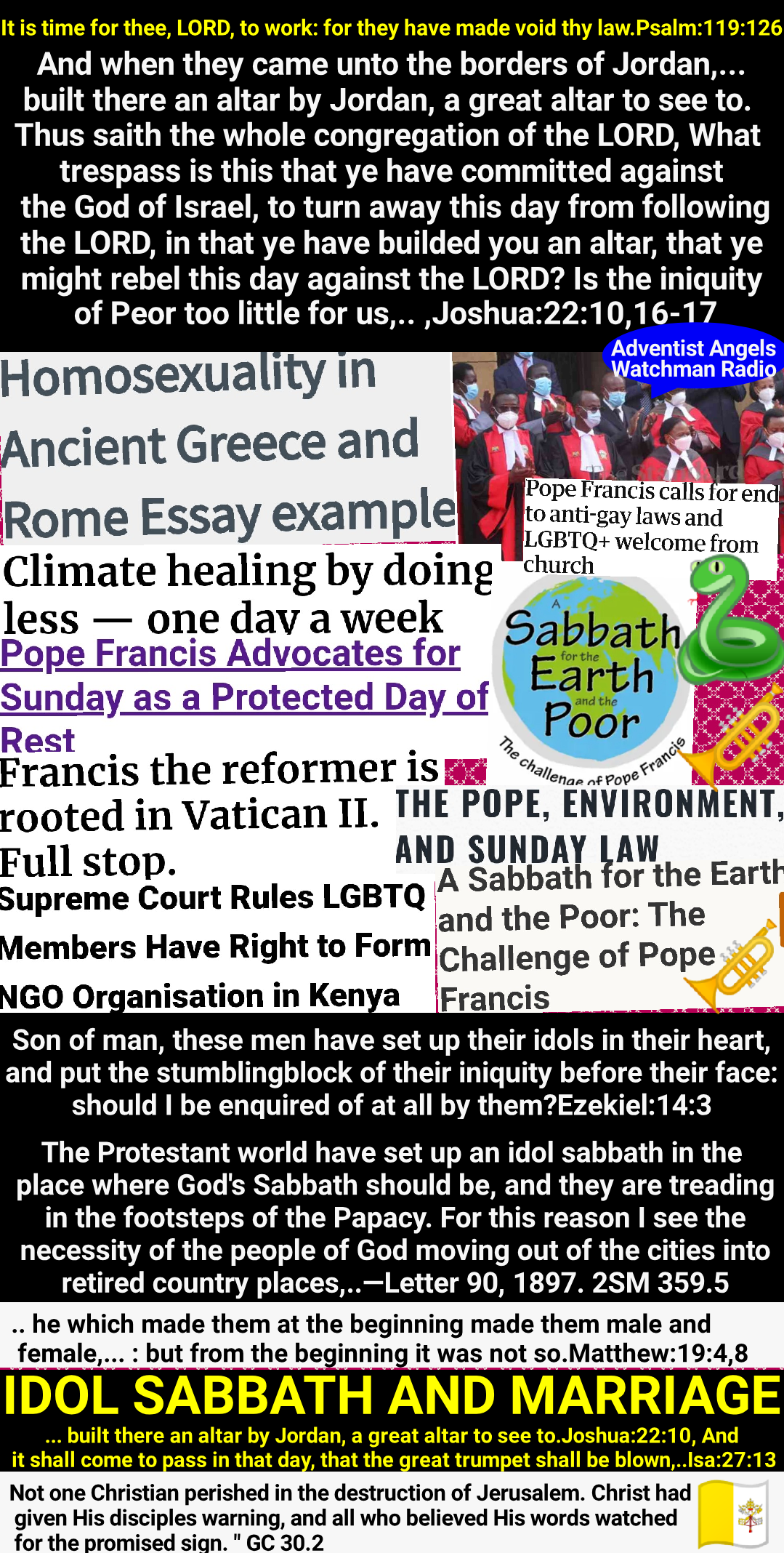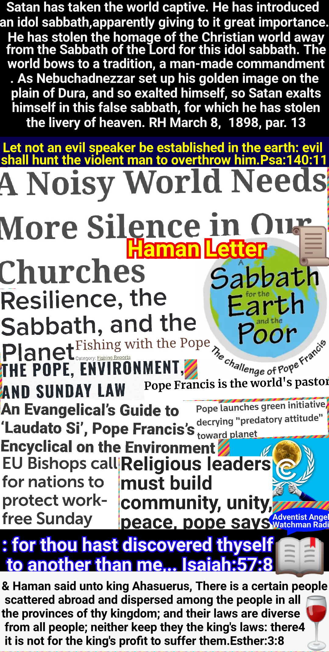 Communications from the spirits will declare that God has sent them to convince the rejecters of Sunday of their error, affirming that the laws of the land should be obeyed as the law of God. They will lament the great wickedness in the world, and second the testimony of religious teachers, that the degraded state of morals is caused by the desecration of Sunday. Great will be the indignation excited against all who refuse to accept their testimony.
