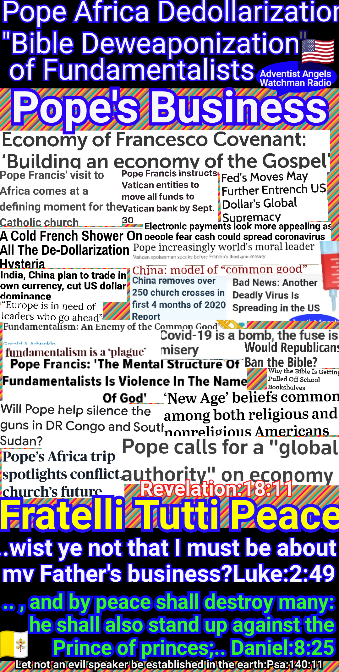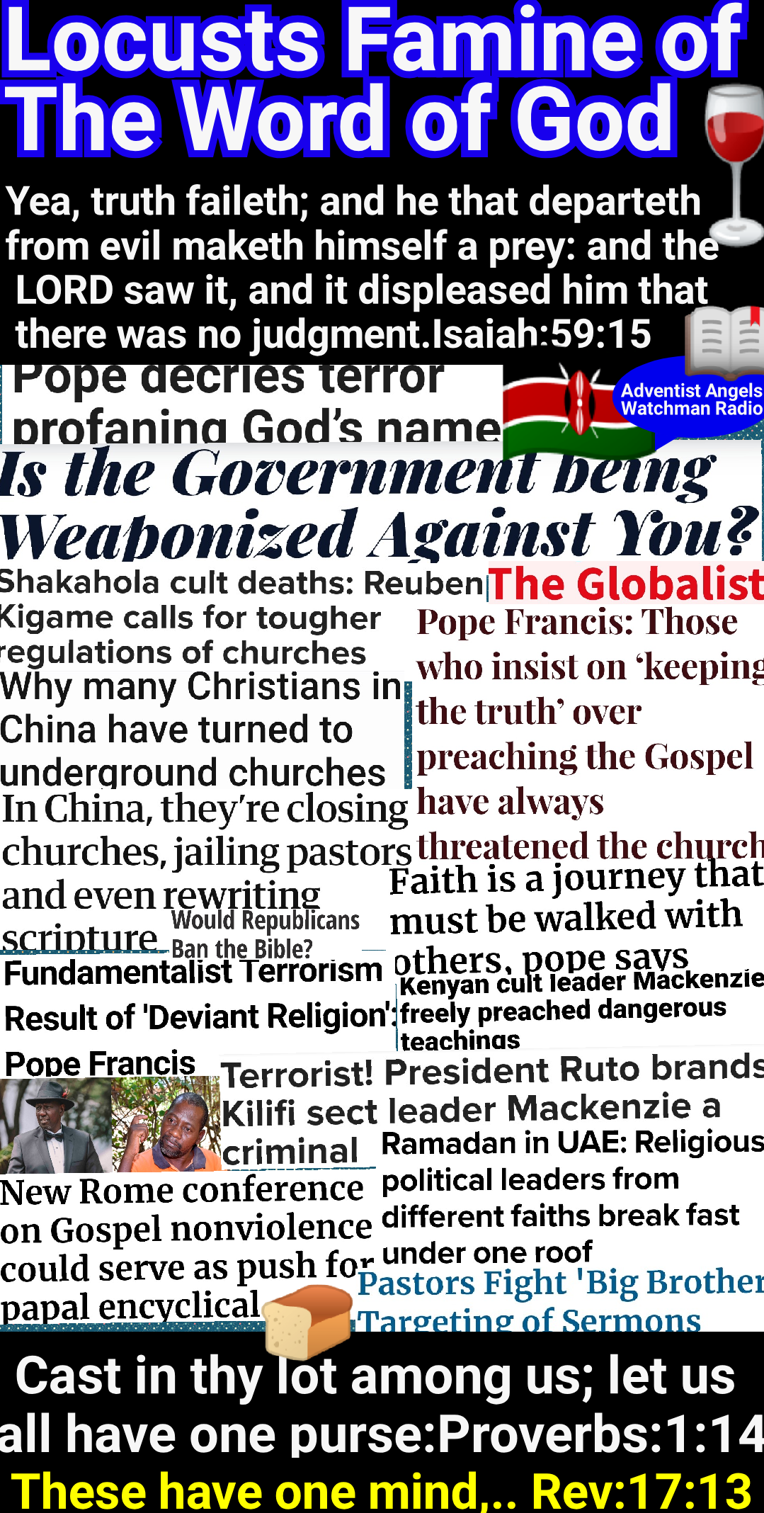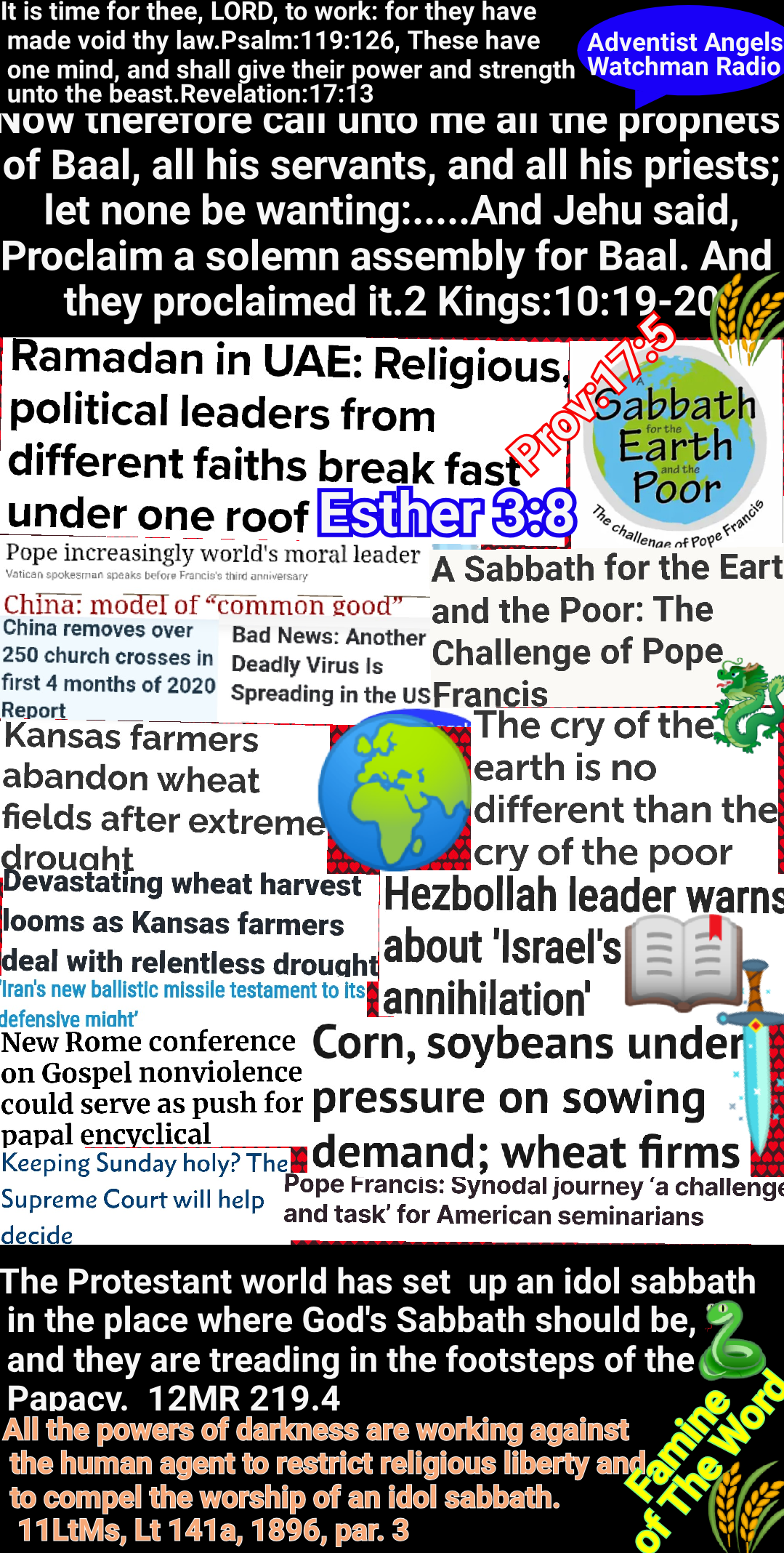 The beast with two horns “causeth commands all, both small and great, rich and poor, free and bond, to receive a mark in their right hand, or in their foreheads: and that no man might buy or sell, save he that had the mark, or the name of the beast, or the number of his name.” Revelation 13:16, 17. The third angel’s warning is: “If any man worship the beast and his image, and receive his mark in his forehead, or in his hand, the same shall drink of the wine of the wrath of God.” “The beast” mentioned in this message, whose worship is enforced by the two-horned beast, is the first, or leopardlike beast of Revelation 13—the papacy. The “image to the beast” represents that form of apostate Protestantism which will be developed when the Protestant churches shall seek the aid of the civil power for the enforcement of their dogmas. GC 443.3 – GC 445.2