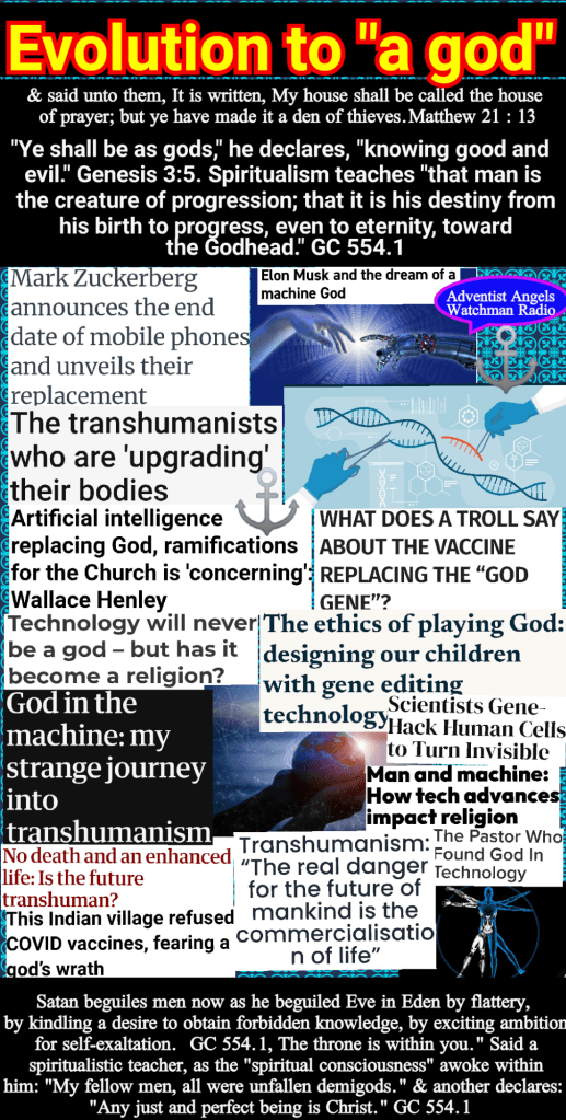“Ye shall be as gods,” he declares, “knowing good and evil.” Genesis 3:5. Spiritualism teaches “that man is the creature of progression; that it is his destiny from his birth to progress, even to eternity, toward the Godhead.” And again: “Each mind will judge itself and not another.” “The judgment will be right, because it is the judgment of self…. The throne is within you.” Said a spiritualistic teacher, as the “spiritual consciousness” awoke within him: “My fellow men, all were unfallen demigods.” And another declares: “Any just and perfect being is Christ.” GC 554.1