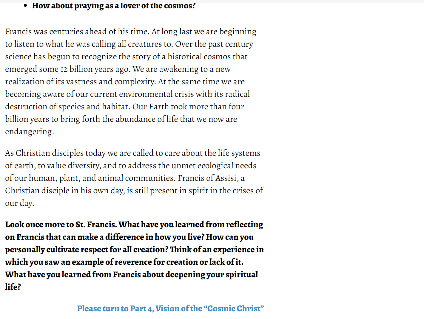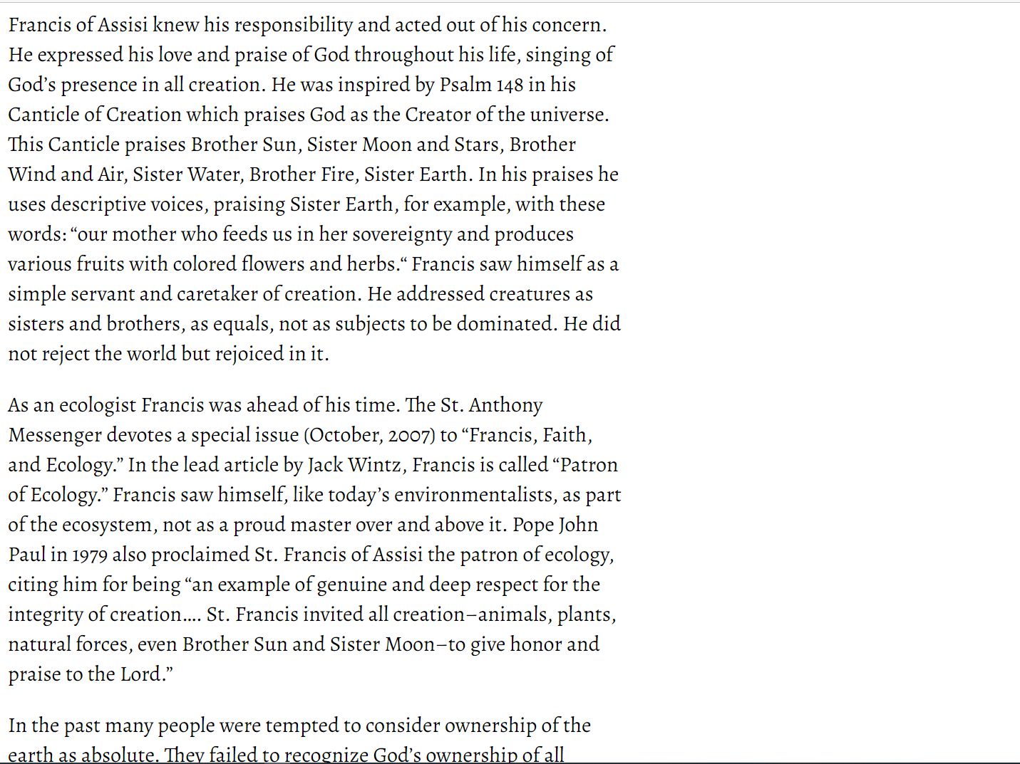 Pope Francis is saying that we are doing injustices to sister Stone and sister Water so let all humanity unite against those killing Sister Water. But in observing the metaphors used here it represents Joseph dreaming to save brethren from coming scourge of famine. Is God Coming to take stones to heaven? Who are the creatures spoken here? Who are the all creatures to be preached to?