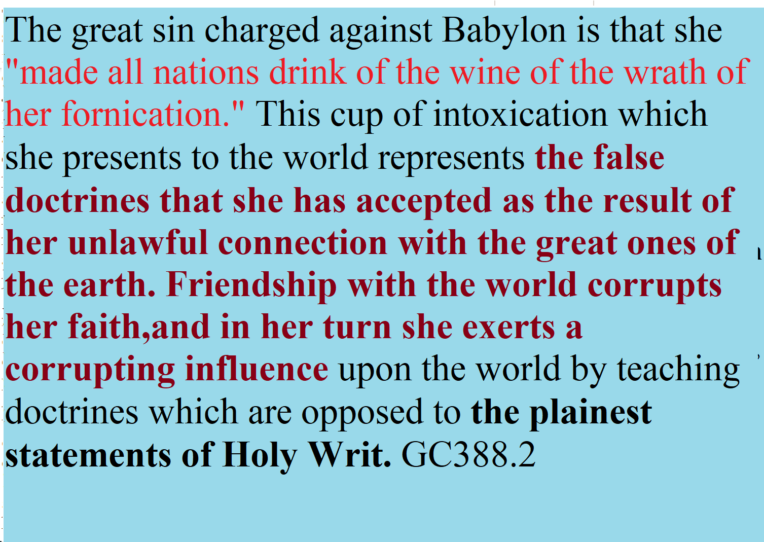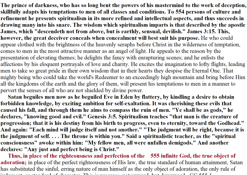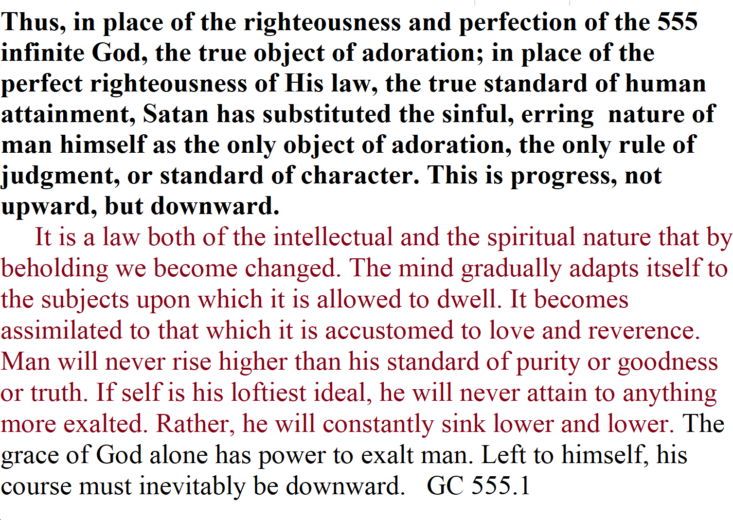 The papacy has attempted to change the law of God. The second commandment, forbidding image worship, has been dropped from the law, and the fourth commandment has been so changed as to authorize the observance of the first instead of the seventh day as the Sabbath. But papists urge, as a reason for omitting the second commandment, that it is unnecessary, being included in the first, and that they are giving the law exactly as God designed it to be understood. This cannot be the change foretold by the prophet. An intentional, deliberate change is presented: “He shall think to change the times and the law.” The change in the fourth commandment exactly fulfills the prophecy. For this the only authority claimed is that of the church. Here the papal power openly sets itself above God. GC 445.1 – GC 446.2