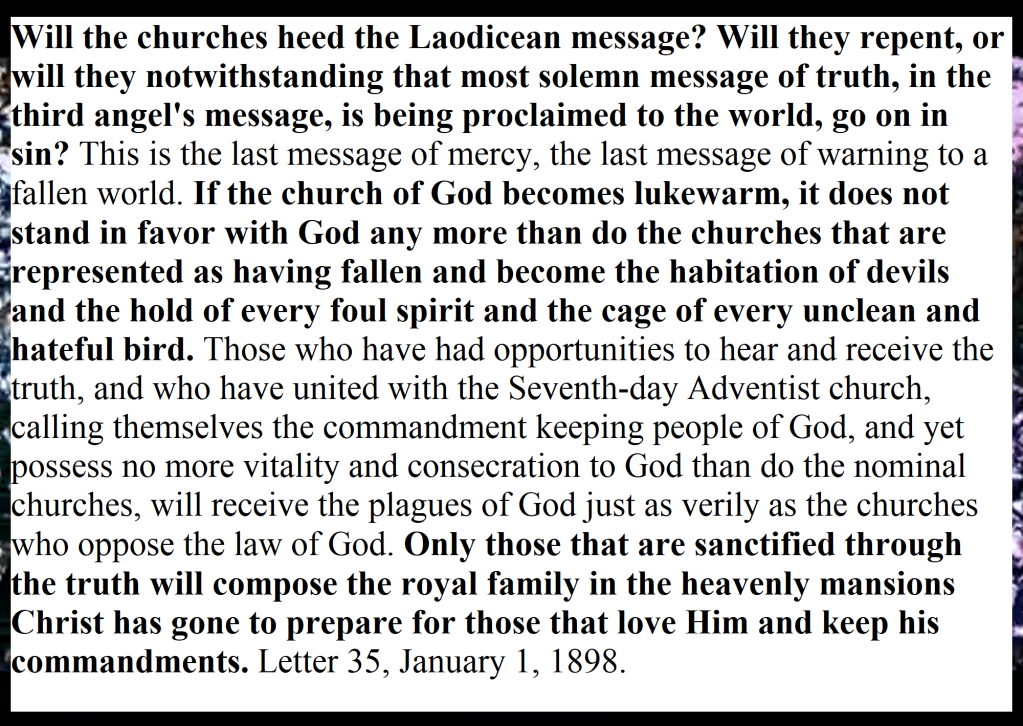 The churches have been cherishing a spirit which God cannot approve; and unless they humble their souls before God and possess a different spirit, they will reject God’s light and follow spurious light to the ruin of their own and many other souls. 1888 96.1 – 1888 96.2