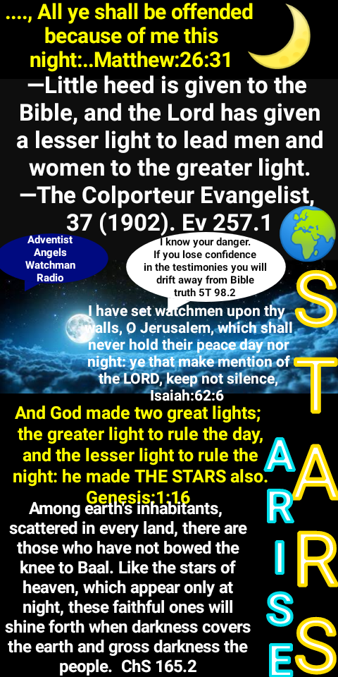 The days are fast approaching when there will be great perplexity and confusion. Satan, clothed in angel robes, will deceive, if possible, the very elect. There will be gods many and lords many. Every wind of doctrine will be blowing. Those who have rendered supreme homage to “science falsely so called” will not be the leaders then. Those who have trusted to intellect, genius, or talent will not then stand at the head of rank and file. They did not keep pace with the light. Those who have proved themselves unfaithful will not then be entrusted with the flock. In the last solemn work few great men will be engaged. They are self-sufficient, independent of God, and He cannot use them. The Lord has faithful servants, who in the shaking, testing time will be disclosed to view. There are precious ones now hidden who have not bowed the knee to Baal. They have not had the light which has been shining in a concentrated blaze upon you. But it may be under a rough and uninviting exterior the pure brightness of a genuine Christian character will be revealed. In the day time we look toward heaven but do not see the stars. They are there, fixed in the firmament, but the eye cannot distinguish them. In the night we behold their genuine luster. The time is not far distant when the test will come to every soul. The mark of the beast will be urged upon us. Those who have step by step yielded to worldly demands and conformed to worldly customs will not find it a hard matter to yield to the powers that be, rather than subject themselves to derision, insult, threatened imprisonment, and death. The contest is between the commandments of God and the commandments of men. In this time the gold will be separated from the dross in the church. True godliness will be clearly distinguished from the appearance and tinsel of it. Many a star that we have admired for its brilliancy will then go out in darkness. Chaff like a cloud will be borne away on the wind, even from places where we see only floors of rich wheat. All who assume the ornaments of the sanctuary, but are not clothed with Christ’s righteousness, will appear in the shame of their own nakedness. When trees without fruit are cut down as cumberers of the ground, when multitudes of false brethren are distinguished from the true, then the hidden ones will be revealed to view, and with hosannas range under the banner of Christ. Those who have been timid and self-distrustful will declare themselves openly for Christ and His truth. The most weak and hesitating in the church will be as David—willing to do and dare. The deeper the night for God’s people, the more brilliant the stars. Satan will sorely harass the faithful; but, in the name of Jesus, they will come off more than conquerors. Then will the church of Christ appear “fair as the moon, clear as the sun, and terrible as an army with banners.” 5T 80.1 – 5T 81.2