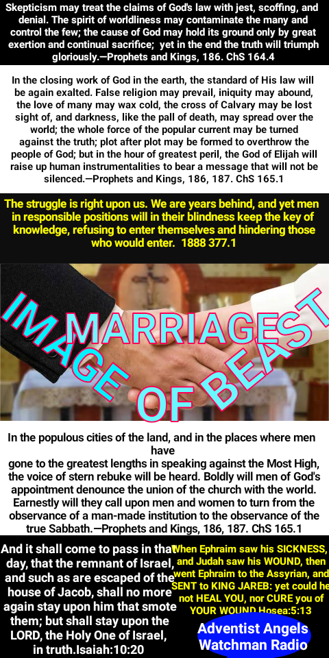 When the leading churches of the United States, uniting upon such points of doctrine as are held by them in common, shall influence the state to enforce their decrees and to sustain their institutions, then Protestant America will have formed an image of the Roman hierarchy, and the infliction of civil penalties upon dissenters will inevitably result. The beast with two horns “causeth commands all, both small and great, rich and poor, free and bond, to receive a mark in their right hand, or in their foreheads: and that no man might buy or sell, save he that had the mark, or the name of the beast, or the number of his name.” Revelation 13:16, 17. The third angel’s warning is: “If any man worship the beast and his image, and receive his mark in his forehead, or in his hand, the same shall drink of the wine of the wrath of God.” “The beast” mentioned in this message, whose worship is enforced by the two-horned beast, is the first, or leopardlike beast of Revelation 13—the papacy. The “image to the beast” represents that form of apostate Protestantism which will be developed when the Protestant churches shall seek the aid of the civil power for the enforcement of their dogmas. The “mark of the beast” still remains to be defined.