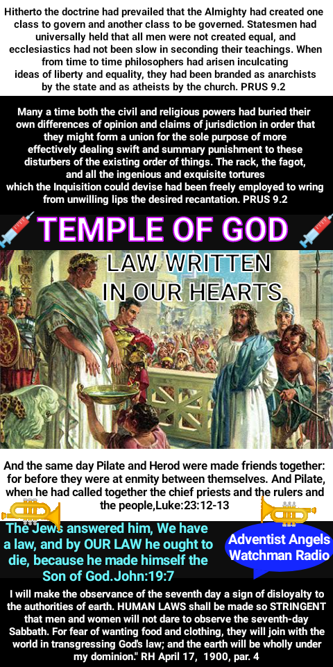 Charles Beecher, in a sermon in the year 1846, declared that the ministry of “the evangelical Protestant denominations” is “not only formed all the way up under a tremendous pressure of merely human fear, but they live, and move, and breathe in a state of things radically corrupt, and appealing every hour to every baser element of their nature to hush up the truth, and bow the knee to the power of apostasy. Was not this the way things went with Rome? Are we not living her life over again? And what do we see just ahead? Another general council! A world’s convention! Evangelical alliance, and universal creed!”—Sermon on “The Bible a Sufficient Creed,” delivered at Fort Wayne, Indiana, Feb. 22, 1846. When this shall be gained, then, in the effort to secure complete uniformity, it will be only a step to the resort to force.