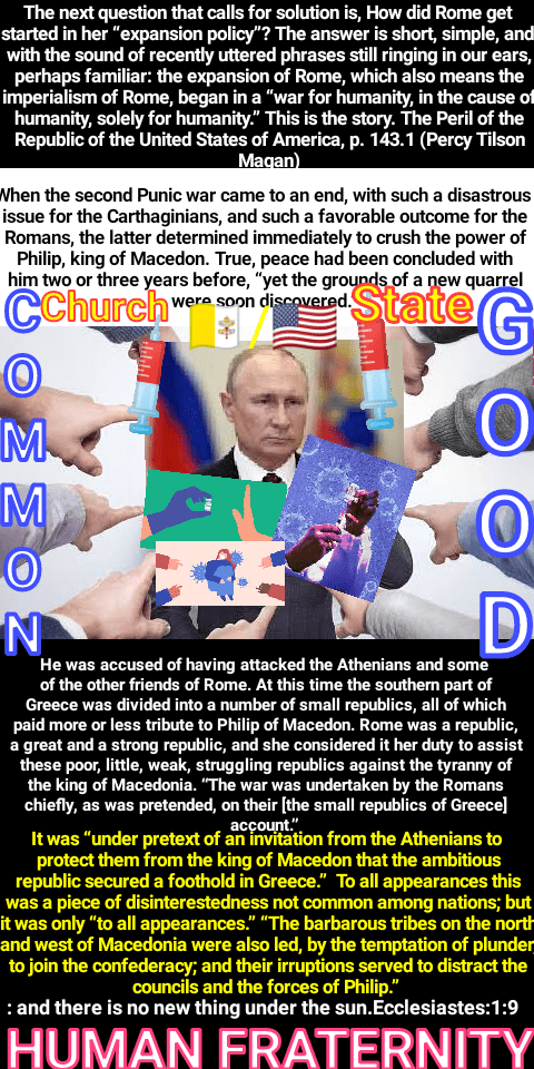This is a good description of the territory of Rome’s expansion, and what she did with it, when once it fell into her possession. The next question that calls for solution is, How did Rome get started in her “expansion policy”? The answer is short, simple, and, with the sound of recently uttered phrases still ringing in our ears, perhaps familiar: the expansion of Rome, which also means the imperialism of Rome, began in a “war for humanity, in the cause of humanity, solely for humanity.” This is the story.