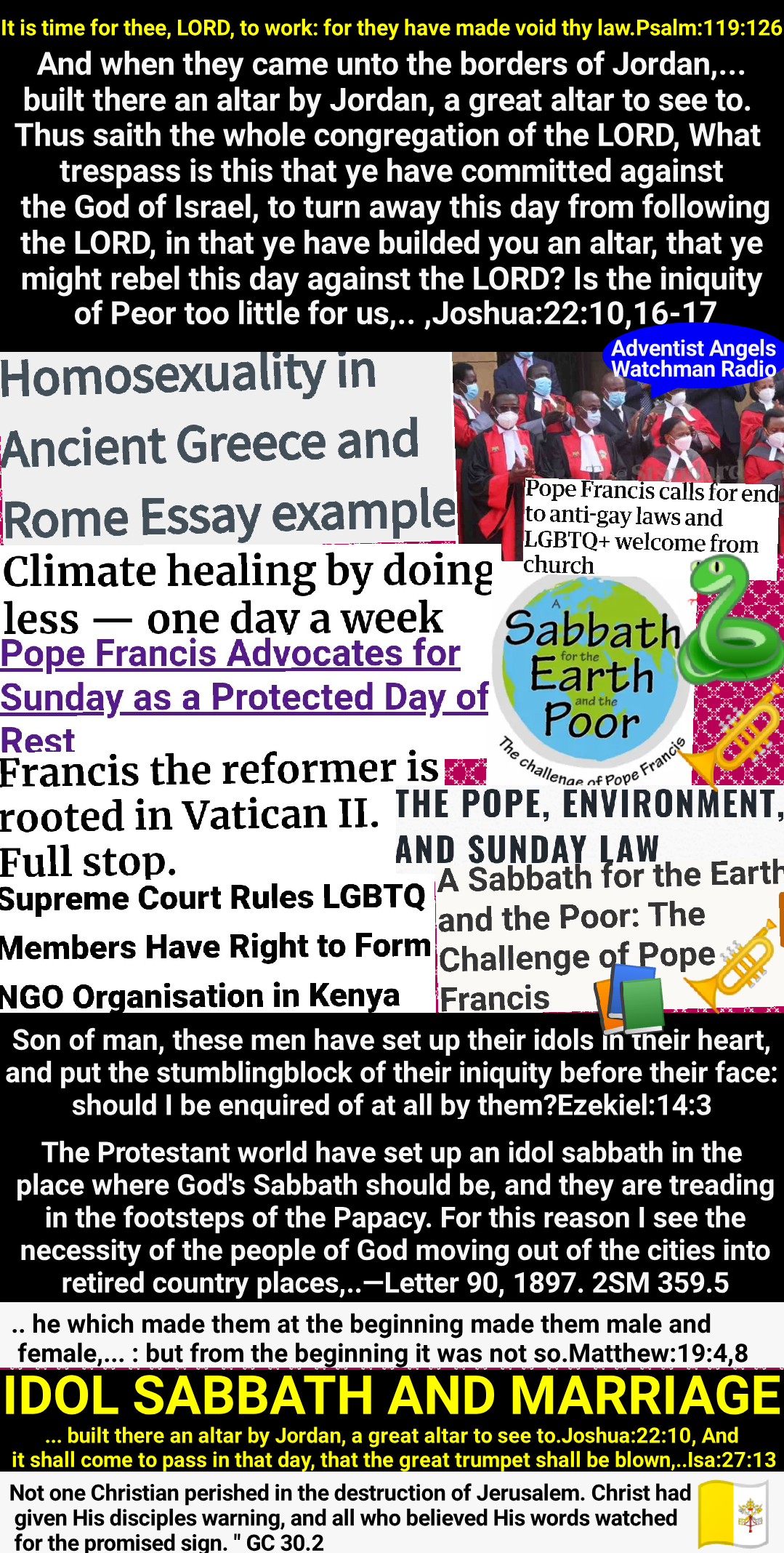 The Sabbath will be the great test of loyalty, for it is the point of truth especially controverted. When the final test shall be brought to bear upon men, then the line of distinction will be drawn between those who serve God and those who serve Him not. While the observance of the false sabbath in compliance with the law of the state, contrary to the fourth commandment, will be an avowal of allegiance to a power that is in opposition to God, the keeping of the true Sabbath, in obedience to God’s law, is an evidence of loyalty to the Creator. While one class, by accepting the sign of submission to earthly powers, receive the mark of the beast, the other, choosing the token of allegiance to divine authority, receive the seal of God.
