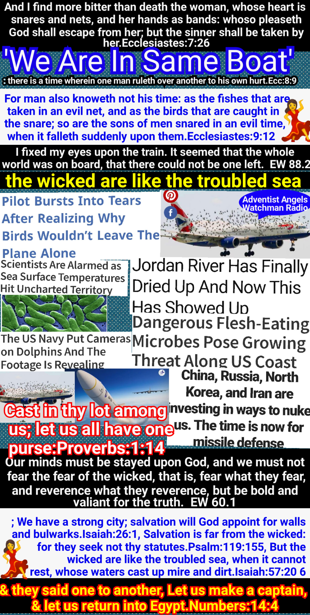 Everything in the world is in agitation. The signs of the times are ominous. Coming events cast their shadows before. The Spirit of God is withdrawing from the earth, and calamity follows calamity by sea and by land. There are tempests, earthquakes, fires, floods, murders of every grade. Who can read the future? Where is security? There is assurance in nothing that is human or earthly. Rapidly men are ranging themselves under the banner they have chosen. Restlessly they are waiting and watching the movements of their leaders. ST July 6, 1904, par. 1