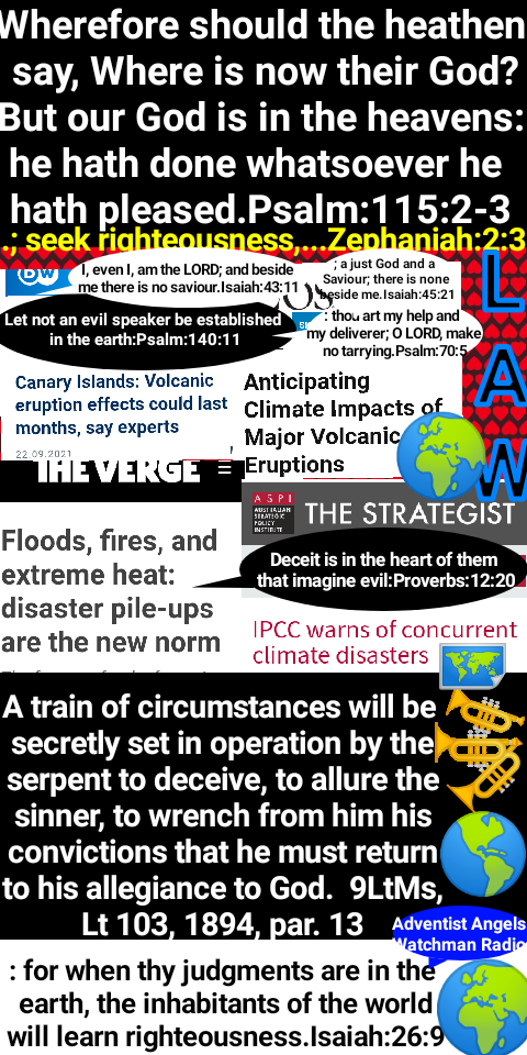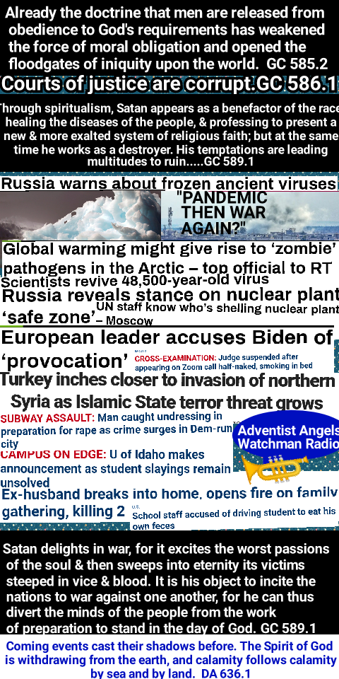 Everything in the world is in agitation. The signs of the times are ominous. Coming events cast their shadows before. The Spirit of God is withdrawing from the earth, and calamity follows calamity by sea and by land. There are tempests, earthquakes, fires, floods, murders of every grade. Who can read the future? Where is security? There is assurance in nothing that is human or earthly. Rapidly men are ranging themselves under the banner they have chosen. Restlessly they are waiting and watching the movements of their leaders. ST July 6, 1904, par. 1