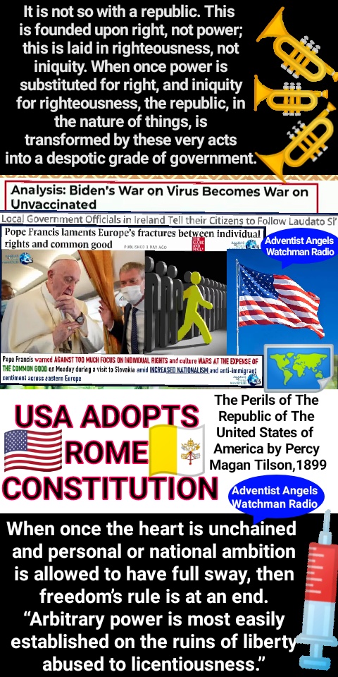 In the proud parade of nations,-princes, potentates, and powers,-which, since the gray dawn of the nineteenth century, have with serried ranks, in tramping column and marching file, maneuvered and deployed upon the grand plateau of human history, one, one only, and one alone,-the United States, has broken out her banners to the breezes, and nobly declared her right to a place in the galaxy of great world-powers because she stood for a priceless principle, eternal as the heavens. All others have stood upon might; this one, and this one alone, upon irresistible, impregnable right.The Perils of the Republic of The United States of America by Percy Magan Tilson, 1898Adventist Angels Watchman Radio Live International 📻