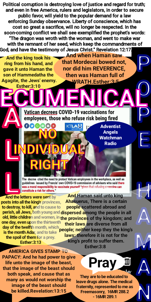 Satan’s Efforts to Destroy the Sabbath Memorial of the Creation.7LtMs, Ms 24, 1891All society is ranging into two great classes, the obedient and the disobedient. Among which class shall we be found? Those who keep God’s commandments, those who live not by bread alone, but by every word that proceedeth out of the mouth of God, compose the church of the living God. Those who choose to follow antichrist are subjects of the great apostate. Ranged under the banner of Satan, they break God’s law, and lead others to break it. They endeavor so to frame the laws of nations that men shall show their loyalty to earthly governments by trampling upon the laws of God’s kingdom. Satan is diverting minds with unimportant questions, in order that they shall not with clear and distinct vision see matters of vast importance. The enemy is planning to ensnare the world. The so-called Christian world is to be the theater of great and decisive actions. Men in authority will enact laws controlling the conscience, after the example of the Papacy. Babylon will make all nations drink of the wine of the wrath of her fornication. Every nation will be involved. Of this time John the Revelator declares: “The merchants of the earth are waxed rich through the abundance of her delicacies. And I heard another voice from heaven saying, Come out of her, My people, that ye be not partakers of her sins, and that ye receive not of her plagues. For her sins have reached unto heaven, and God hath remembered her iniquities. Reward her even as she rewarded you, and double unto her according to her works: in the cup which she hath filled fill to her double. How much she hath glorified herself, and lived deliciously, so much torment and sorrow give her; for she saith in her heart, I sit a queen, and am no widow, and shall see no sorrow.” Revelation 18:3-7. “These have one mind, and shall give their power and strength unto the beast. These shall make war with the Lamb, and the Lamb shall overcome them: for He is Lord of lords, and King of kings: and they that are with Him are called, and chosen, and faithful.” Revelation 17:13, 14. “These have one mind.” There will be a universal bond of union, one great harmony, a confederacy of Satan’s forces. “And shall give their power and strength unto the beast.” Thus is manifested the same arbitrary, oppressive power against religious liberty, freedom to worship God according to the dictates of conscience, as was manifested by the papacy, when in the past it persecuted those who dared to refuse to conform with the religious rites and ceremonies of Romanism. In the warfare to be waged in the last days there will be united, in opposition to God’s people, all the corrupt powers that have apostatized from allegiance to the law of Jehovah. In this warfare the Sabbath of the fourth commandment will be the great point at issue, for in the Sabbath commandment the great Law-giver identifies Himself as the Creator of the heavens and the earth. Satan tempted Christ with bribes, promising that if He would worship him, He should have the kingdoms of the world. The enemy well knew that if the Saviour should worship him, the kingdoms of the world could never become the kingdoms of our God and of His Son, Christ Jesus. Likewise, in the last great issue between Christ’s followers and the powers of darkness, Satan offers his bribes to men and women. Some sell themselves for naught, for what shall it profit a man, if he gain the whole world, and lose his own soul? In the place of the bribes he offered Christ, Satan comes to God’s people in this age of the world with the laws of nations in his hands, declaring: “I now have matters arranged. You must worship me, or else your rights of protection from the world will be withdrawn from you.” 7LtMs, Ms 24, 1891 – 7LtMs, Ms 24, 1891, par. 19
