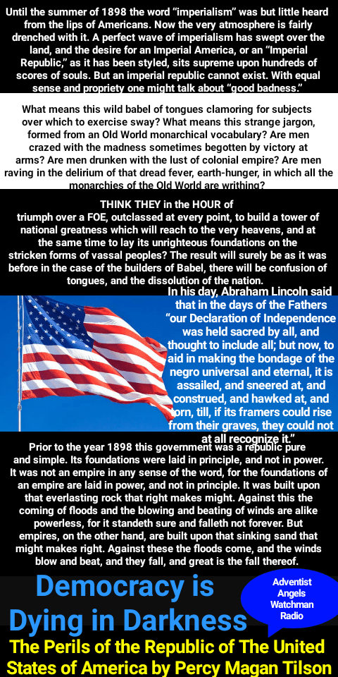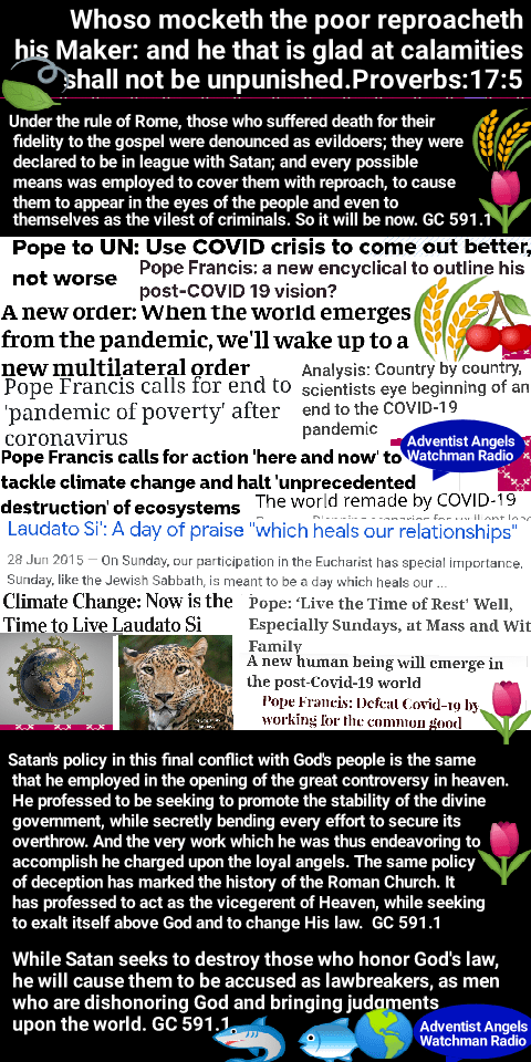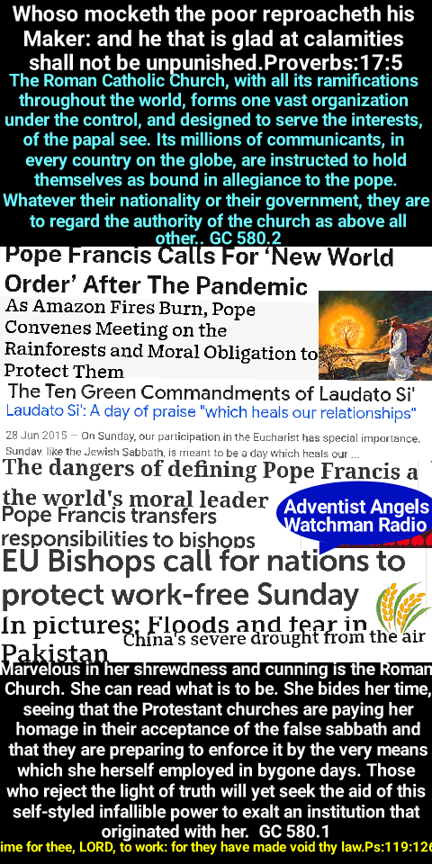 While appearing to the children of men as a great physician who can heal all their maladies, he will bring disease and disaster, until populous cities are reduced to ruin and desolation. Even now he is at work. In accidents and calamities by sea and by land, in great conflagrations, in fierce tornadoes and terrific hailstorms, in tempests, floods, cyclones, tidal waves, and earthquakes, in every place and in a thousand forms, Satan is exercising his power. He sweeps away the ripening harvest, and famine and distress follow. He imparts to the air a deadly taint, and thousands perish by the pestilence. These visitations are to become more and more frequent and disastrous. Destruction will be upon both man and beast. “The earth mourneth and fadeth away,” “the haughty people … do languish. The earth also is defiled under the inhabitants thereof; because they have transgressed the laws, changed the ordinance, broken the everlasting covenant.” Isaiah 24:4, 5. And then the great deceiver will persuade men that those who serve God are causing these evils. The class that have provoked the displeasure of Heaven will charge all their troubles upon those whose obedience to God’s commandments is a perpetual reproof to transgressors. It will be declared that men are offending God by the violation of the Sunday sabbath; that this sin has brought calamities which will not cease until Sunday observance shall be strictly enforced; and that those who present the claims of the fourth commandment, thus destroying reverence for Sunday, are troublers of the people, preventing their restoration to divine favor and temporal prosperity. Thus the accusation urged of old against the servant of God will be repeated and upon grounds equally well established: “And it came to pass, when Ahab saw Elijah, that Ahab said unto him, Art thou he that troubleth Israel? And he answered, I have not troubled Israel; but thou, and thy father’s house, in that ye have forsaken the commandments of the Lord, and thou hast followed Baalim.” 1 Kings 18:17, 18. As the wrath of the people shall be excited by false charges, they will pursue a course toward God’s ambassadors very similar to that which apostate Israel pursued toward Elijah. The miracle-working power manifested through spiritualism will exert its influence against those who choose to obey God rather than men. Communications from the spirits will declare that God has sent them to convince the rejecters of Sunday of their error, affirming that the laws of the land should be obeyed as the law of God. They will lament the great wickedness in the world and second the testimony of religious teachers that the degraded state of morals is caused by the desecration of Sunday. Great will be the indignation excited against all who refuse to accept their testimony. Satan’s policy in this final conflict with God’s people is the same that he employed in the opening of the great controversy in heaven. He professed to be seeking to promote the stability of the divine government, while secretly bending every effort to secure its overthrow. And the very work which he was thus endeavoring to accomplish he charged upon the loyal angels. The same policy of deception has marked the history of the Roman Church. It has professed to act as the vicegerent of Heaven, while seeking to exalt itself above God and to change His law. Under the rule of Rome, those who suffered death for their fidelity to the gospel were denounced as evildoers; they were declared to be in league with Satan; and every possible means was employed to cover them with reproach, to cause them to appear in the eyes of the people and even to themselves as the vilest of criminals. So it will be now. While Satan seeks to destroy those who honor God’s law, he will cause them to be accused as lawbreakers, as men who are dishonoring God and bringing judgments upon the world. God never forces the will or the conscience; but Satan’s constant resort—to gain control of those whom he cannot otherwise seduce—is compulsion by cruelty. Through fear or force he endeavors to rule the conscience and to secure homage to himself. To accomplish this, he works through both religious and secular authorities, moving them to the enforcement of human laws in defiance of the law of God. Those who honor the Bible Sabbath will be denounced as enemies of law and order, as breaking down the moral restraints of society, causing anarchy and corruption, and calling down the judgments of God upon the earth. Their conscientious scruples will be pronounced obstinacy, stubbornness, and contempt of authority. They will be accused of disaffection toward the government. Ministers who deny the obligation of the divine law will present from the pulpit the duty of yielding obedience to the civil authorities as ordained of God. In legislative halls and courts of justice, commandment keepers will be misrepresented and condemned. A false coloring will be given to their words; the worst construction will be put upon their motives. As the Protestant churches reject the clear, Scriptural arguments in defense of God’s law, they will long to silence those whose faith they cannot overthrow by the Bible. Though they blind their own eyes to the fact, they are now adopting a course which will lead to the persecution of those who conscientiously refuse to do what the rest of the Christian world are doing, and acknowledge the claims of the papal sabbath. The dignitaries of church and state will unite to bribe, persuade, or compel all classes to honor the Sunday. The lack of divine authority will be supplied by oppressive enactments. Political corruption is destroying love of justice and regard for truth; and even in free America, rulers and legislators, in order to secure public favor, will yield to the popular demand for a law enforcing Sunday observance. Liberty of conscience, which has cost so great a sacrifice, will no longer be respected. In the soon
