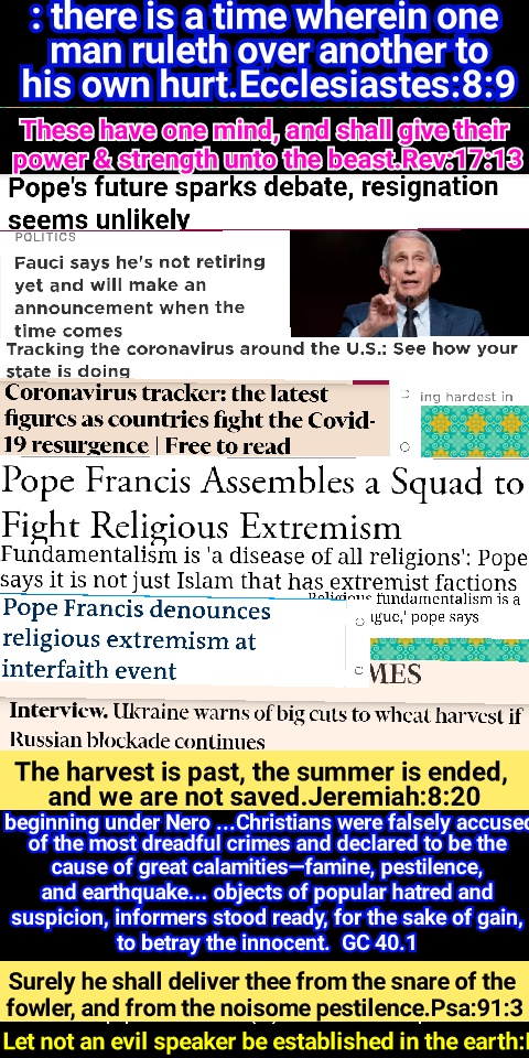 Those who honor the Bible Sabbath will be denounced as enemies of law and order, as breaking down the moral restraints of society, causing anarchy and corruption, and calling down the judgments of God upon the earth. Their conscientious scruples will be pronounced obstinacy, stubbornness, and contempt of authority. They will be accused of disaffection toward the government. Ministers who deny the obligation of the divine law will present from the pulpit the duty of yielding obedience to the civil authorities as ordained of God. In legislative halls and courts of justice, commandment keepers will be misrepresented and condemned. A false coloring will be given to their words; the worst construction will be put upon their motives. As the Protestant churches reject the clear, Scriptural arguments in defense of God’s law, they will long to silence those whose faith they cannot overthrow by the Bible. Though they blind their own eyes to the fact, they are now adopting a course which will lead to the persecution of those who conscientiously refuse to do what the rest of the Christian world are doing, and acknowledge the claims of the papal sabbath. GC 592.1 – GC 592.2