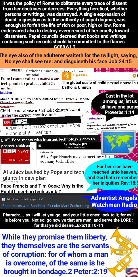 A striking illustration of Rome’s policy toward those who disagree with her was given in the long and bloody persecution of the Waldenses, some of whom were observers of the Sabbath. Others suffered in a similar manner for their fidelity to the fourth commandment. The history of the churches of Ethiopia and Abyssinia is especially significant. Amid the gloom of the Dark Ages, the Christians of Central Africa were lost sight of and forgotten by the world, and for many centuries they enjoyed freedom in the exercise of their faith. But at last Rome learned of their existence, and the emperor of Abyssinia was soon beguiled into an acknowledgment of the pope as the vicar of Christ. Other concessions followed. An edict was issued forbidding the observance of the Sabbath under the severest penalties. (See Michael Geddes, Church History of Ethiopia, pages 311, 312.) But papal tyranny soon became a yoke so galling that the Abyssinians determined to break it from their necks. After a terrible struggle the Romanists were banished from their dominions, and the ancient faith was restored. The churches rejoiced in their freedom, and they never forgot the lesson they had learned concerning the deception, the fanaticism, and the despotic power of Rome. Within their solitary realm they were content to remain, unknown to the rest of Christendom. The churches of Africa held the Sabbath as it was held by the papal church before her complete apostasy. While they kept the seventh day in obedience to the commandment of God, they abstained from labor on the Sunday in conformity to the custom of the church. Upon obtaining supreme power, Rome had trampled upon the Sabbath of God to exalt her own; but the churches of Africa, hidden for nearly a thousand years, did not share in this apostasy. When brought under the sway of Rome, they were forced to set aside the true and exalt the false sabbath; but no sooner had they regained their independence than they returned to obedience to the fourth commandment. (See Appendix.) These records of the past clearly reveal the enmity of Rome toward the true Sabbath and its defenders, and the means which she employs to honor the institution of her creating. The word of God teaches that these scenes are to be repeated as Roman Catholics and Protestants shall unite for the exaltation of the Sunday. The prophecy of Revelation 13 declares that the power represented by the beast with lamblike horns shall cause “the earth and them which dwell therein” to worship the papacy—there symbolized by the beast “like unto a leopard.” The beast with two horns is also to say “to them that dwell on the earth, that they should make an image to the beast;” and, furthermore, it is to command all, “both small and great, rich and poor, free and bond,” to receive the mark of the beast. Revelation 13:11-16. It has been shown that the United States is the power represented by the beast with lamblike horns, and that this prophecy will be fulfilled when the United States shall enforce Sunday observance, which Rome claims as the special acknowledgment of her supremacy. But in this homage to the papacy the United States will not be alone. The influence of Rome in the countries that once acknowledged her dominion is still far from being destroyed. And prophecy foretells a restoration of her power. “I saw one of his heads as it were wounded to death; and his deadly wound was healed: and all the world wondered after the beast.” Verse 3. The infliction of the deadly wound points to the downfall of the papacy in 1798.After this, says the prophet, “his deadly wound was healed: and all the world wondered after the beast.” Paul states plainly that the “man of sin” will continue until the second advent. 2 Thessalonians 2:3-8. To the very close of time he will carry forward the work of deception. And the revelator declares, also referring to the papacy: “All that dwell upon the earth shall worship him, whose names are not written in the book of life.” Revelation 13:8. In both the Old and the New World, the papacy will receive homage in the honor paid to the Sunday institution, that rests solely upon the authority of the Roman Church. Since the middle of the nineteenth century, students of prophecy in the United States have presented this testimony to the world. In the events now taking place is seen a rapid advance toward the fulfillment of the prediction. With Protestant teachers there is the same claim of divine authority for Sundaykeeping, and the same lack of Scriptural evidence, as with the papal leaders who fabricated miracles to supply the place of a command from God. The assertion that God’s judgments are visited upon men for their violation of the Sunday-sabbath, will be repeated; already it is beginning to be urged. And a movement to enforce Sunday observance is fast gaining ground. Marvelous in her shrewdness and cunning is the Roman Church. She can read what is to be. She bides her time, seeing that the Protestant churches are paying her homage in their acceptance of the false sabbath and that they are preparing to enforce it by the very means which she herself employed in bygone days. Those who reject the light of truth will yet seek the aid of this self-styled infallible power to exalt an institution that originated with her. How readily she will come to the help of Protestants in this work it is not difficult to conjecture. Who understands better than the papal leaders how to deal with those who are disobedient to the church? The Roman Catholic Church, with all its ramifications throughout the world, forms one vast organization under the control, and designed to serve the interests, of the papal see. Its millions of communicants, in every country on the globe, are instructed to hold themselves as bound in allegiance to the pope. Whatever their nationality or their government, they are to regard the authority of the church as above all other. Though they may take the 