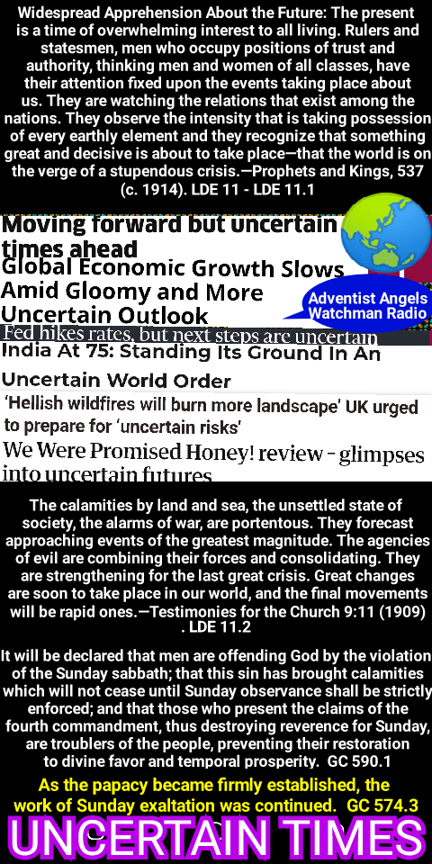 The day of God is right upon us. The world has converted the church. Both are in harmony, and are acting on a short-sighted policy. Protestants will work upon the rulers of the land to make laws to restore the lost ascendancy of the man of sin, who sits in the temple of God, showing himself that he is God. Roman Catholic principles will be taken under the care and protection of the state. This national apostasy will speedily be followed by national ruin. The protest of Bible truth will be no longer tolerated by those who have not made the law of God their rule of life. Then will the voice be heard from the graves of martyrs, represented by the souls that John saw slain for the word of God and the testimony of Jesus Christ which they held; then the prayer will ascend from every true child of God, “It is time for thee, Lord, to work: for they have made void thy law.” When our first parents fell from their high estate through transgression, God’s law was made void. Then Christ entered upon his work as our Redeemer, and probation was granted to the inhabitants of the world. In Noah’s day, men disregarded the law of God until almost all remembrance of him had passed away from the earth. Their wickedness reached so great a height, violence, crime, and every kind of sin became so intensely active, that the Lord brought a flood of water upon the world, and swept away the wicked inhabitants thereof. But mercy was mingled with judgment. Noah and his family were saved. In the destruction of Sodom and Gomorrah, we see that the Lord will interfere; fire came down from heaven, and destroyed those wicked cities. From time to time the Lord has made known his manner of working. He is mindful of what is passing upon the earth; and when a crisis has come, he has revealed himself, and has interposed to hinder the working of Satan’s plans. He has often permitted matters with nations, with families, and with individuals, to come to a crisis, that his interference might become marked. Then he has let the fact be known that there was a God in Israel who would sustain and vindicate his people. When the defiance of the law of Jehovah shall be almost universal, when his people shall be pressed in affliction by their fellow men, God will interpose. The fervent prayers of his people will be answered; for he loves to have his people seek him with all their heart, and depend upon him as their deliverer. He will be sought unto to do these things for his people, and he will arise as the protector and avenger of his people. The promise is, “Shall not God avenge his own elect, which cry day and night unto him? … I tell you that he will avenge them speedily.” The Protestant governments will reach a strange pass. They will be converted to the world. They will also, in their separation from God, work to make falsehood and apostasy from God the law of the nation. In the place of those who have the light of truth allowing jealousy and evil surmisings to come in and weaken their love and union one with another, their united prayers should ascend to heaven for the Lord to arise, and put an end to the violence and abuse which are practised in our world. More prayer and less talk is what God desires, and it would make his people a tower of strength. RH June 15, 1897, par. 10 – RH June 15, 1897, par. 13