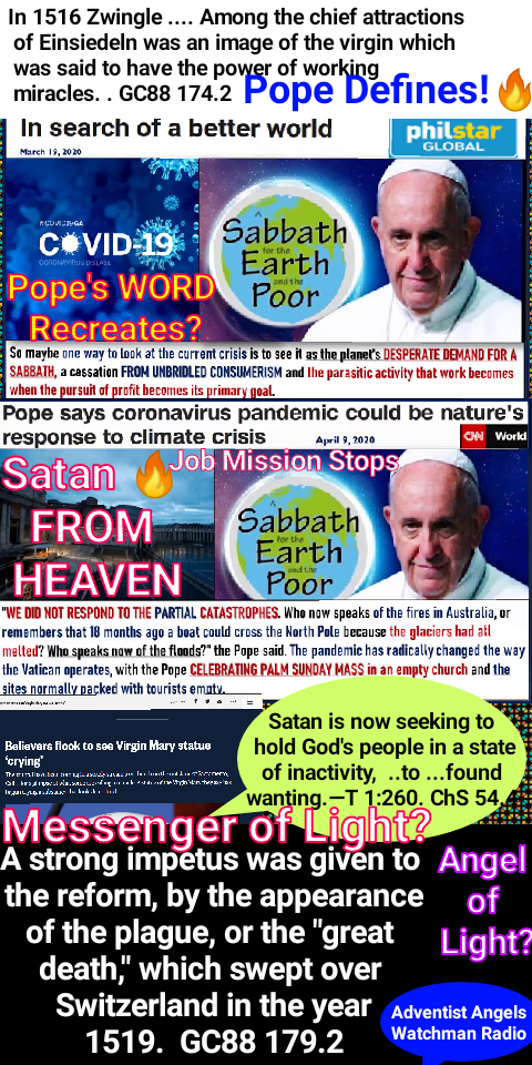 The miracle-working power manifested through spiritualism will exert its influence against those who choose to obey God rather than men. Communications from the spirits will declare that God has sent them to convince the rejecters of Sunday of their error, affirming that the laws of the land should be obeyed as the law of God. They will lament the great wickedness in the world and second the testimony of religious teachers that the degraded state of morals is caused by the desecration of Sunday. Great will be the indignation excited against all who refuse to accept their testimony.