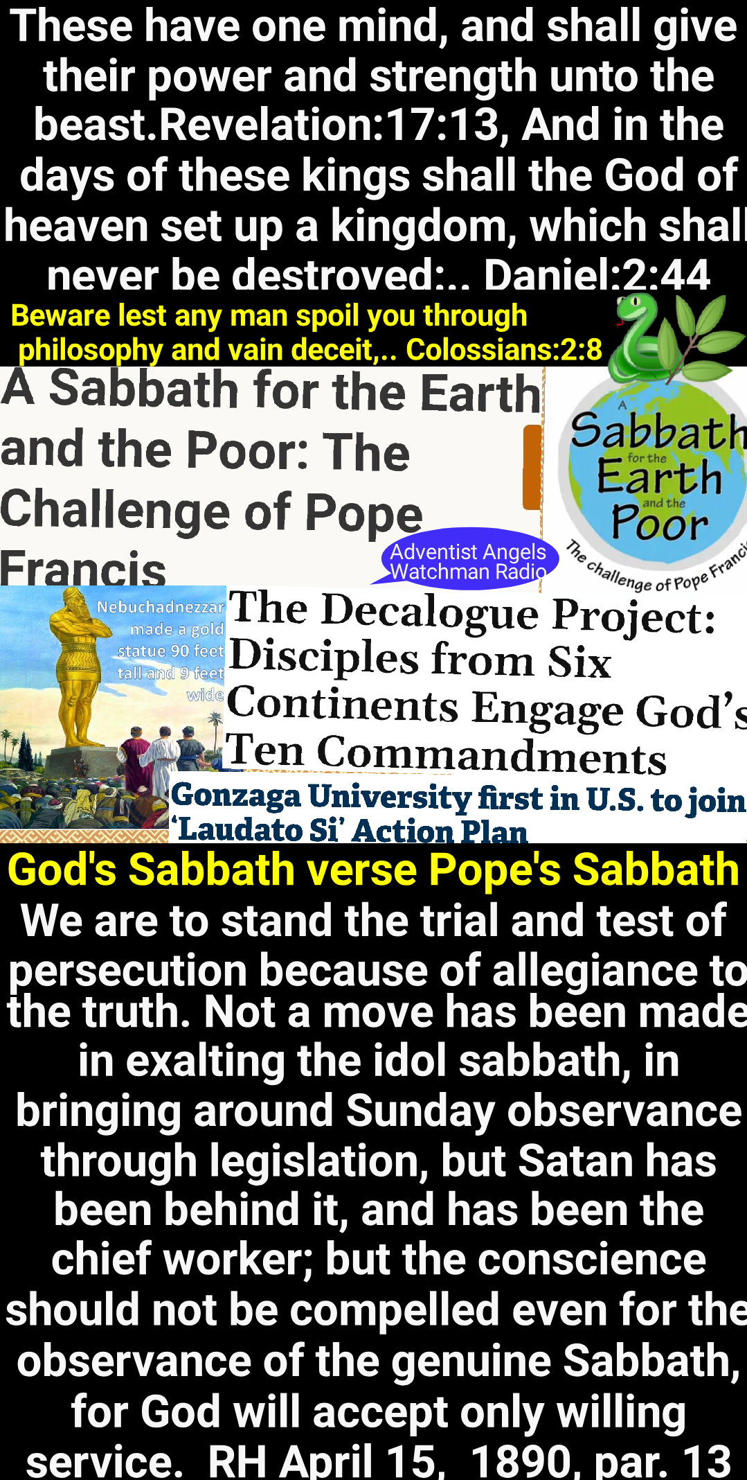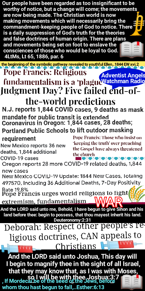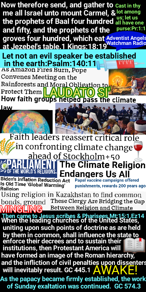 “The Sabbath will be the great test of loyalty; for it is the point of truth especially controverted. When the final test shall be brought to bear upon men, then the line of distinction will be drawn between those who serve God and those who serve him not. While the observance of the false sabbath in compliance with the law of the state, contrary to the fourth commandment, will be an avowal of an allegiance to a power that is in opposition to God, the keeping of the true Sabbath, in obedience to God’s law, is an evidence of loyalty to the Creator. While one class, by accepting the sign of submission to earthly powers, receive the mark of the beast, the other, choosing the token of allegiance to divine authority, receive the seal of God. “Heretofore those who presented the truths of the third angel’s message have been often regarded as mere alarmists…. But as the question of enforcing Sunday observance is widely agitated, the event so long doubted and disbelieved is seen to be approaching, and the third message will produce an effect which it could not have had before.” RH April 27, 1911, par. 17 – RH April 27, 1911, par. 18